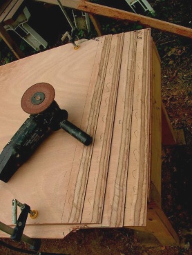 Building the hull first assumes that you've already scarfed the side and bottom ply together to create panels of the correct length. Because these ply joints are wider than the table, you may chose to create them with an angle-grinder while all 4 panels are laid up together, with their datum lines all parallel to each other. Make sure that the forward panels are laid with the outside face down and that the aft panel is laid face up. Now set the edges back from each other by 50 mm—keeping them exactly parallel.