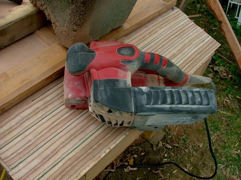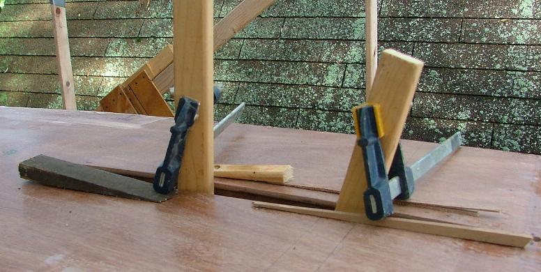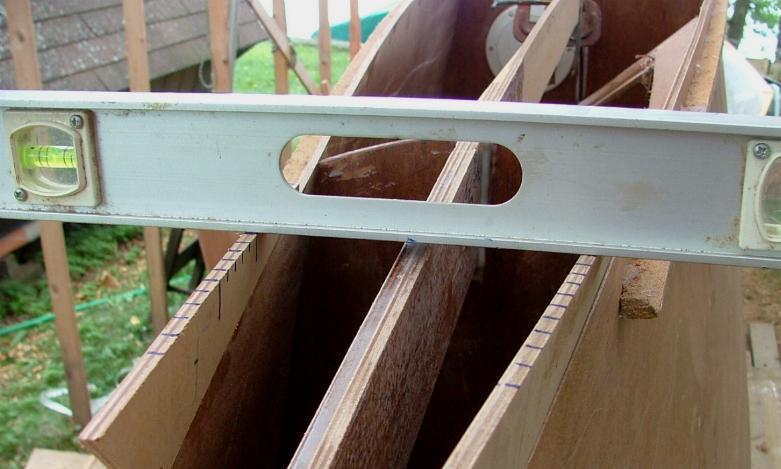 In order to vee the two sides the same, it's a good idea to make two identical wedges with depth markings, and then check with a level (assuming the boat and platform were level in the first place)—see photo.