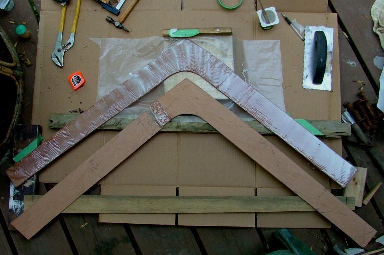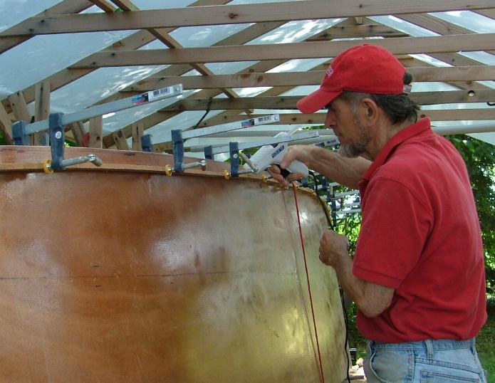You may need to wet the bottom ply surface up forward, to give it the twist it needs—up to about 45°—right at the bow. (See plans and photos.)