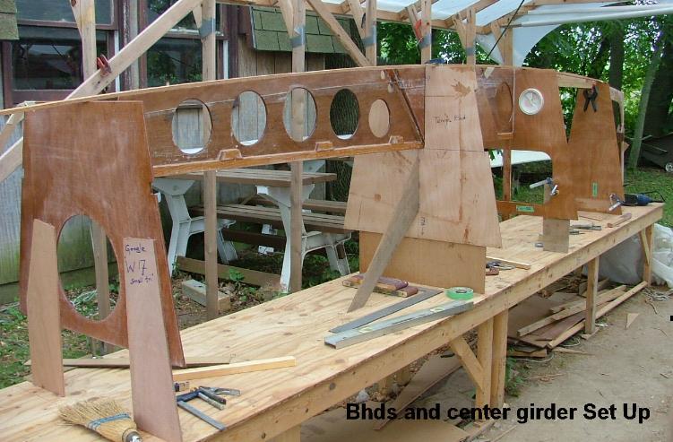 The only thing that occasionally needs a slight adjustment could be the centerline girder. Once all is in line and the curve is fair, bond the aft end of the centerline web to the aft bulkhead, by chamfering off (beveling) the sides of the web, so that the joining epoxy can get almost to the centre of the web plywood—like a weld—which is really much more what a gap-filling cement like epoxy does.