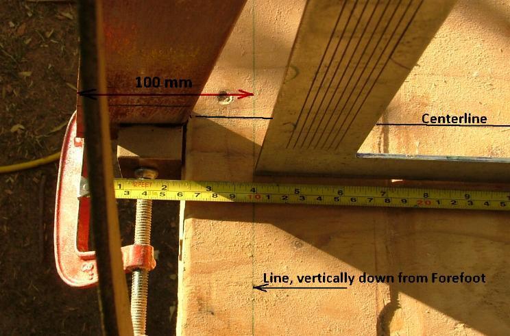 Once the transom is set up at the correct angle and height and the stempiece is attached at the platform, pass a batten from the stempiece to the transom to make sure all looks fair for the bottom ply. The rear edge of the stempiece, should fit against the platform and a block used to screw it there at the right height. Locate the front stem edge with approx 100 mm of rake—see photo.