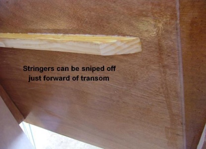 First make a preliminary fit of the side panels, after grinding the reinforcing pads on the stem, flush with the stringers. Once they are well fitting to all frames and stem, drill a 6mm (¼") hole into the stringer, close to the center of the panel. This is to fit a locating pin to guide the final installation back into this same position, once stringers and bulkheads have epoxy applied to them.