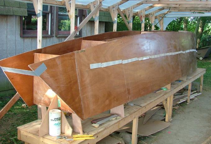 It's worth noting here that with the ABC System, the only joint that is fully completed while the boat is being built upside-down, is the underside of any stringer .., as this will be on top and accessible while building upside down. All the other inside joints are coved and finished only AFTER turning the boat over, when they are far more accessible. Prior to that, the boat is really only 'tack-welded' together with epoxy, so needs to be rotated with some care. ;)