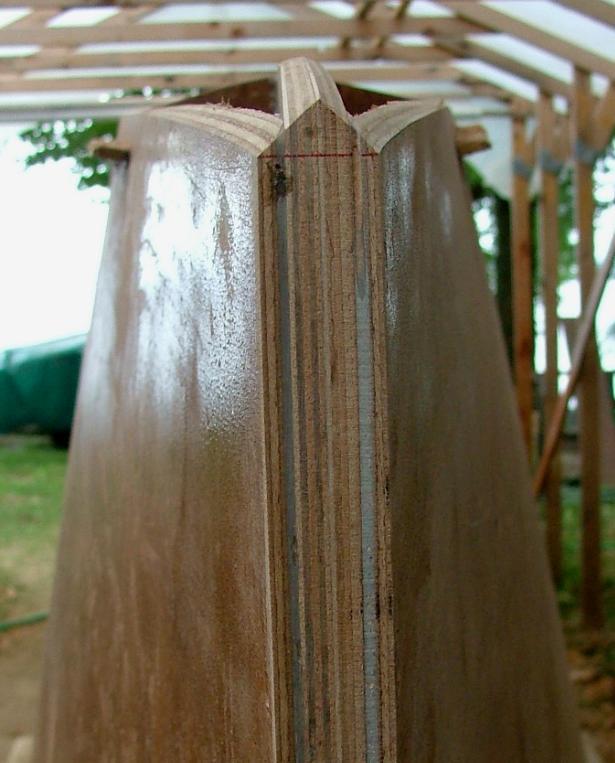 Once joined and cleaned off flush, consider if you will epoxy coat or sheath the inside before it's installed. Do one or the other. I recommend to sheath if using 5mm or less, but epoxy coat will generally be adequate for 6mm ply sides. Also laminate up the main hull stem-piece from the four parts on the drawing.