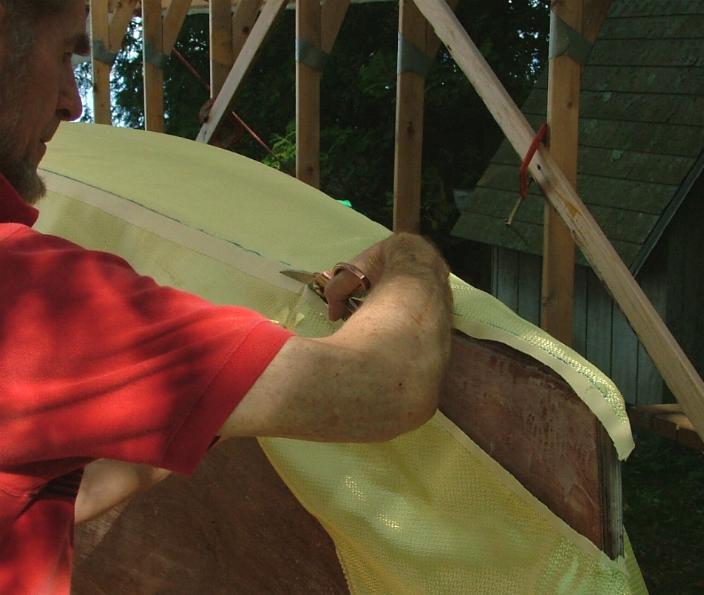 If using Kevlar®, you'll also need to oversheath with a light glass, as Kevlar is virtually impossible to sand without creating woolly fluff. Again, use wax paper and taping to hold down anything that is difficult. Cutting Kevlar is also notoriously difficult but here is a way I've found to 'tame the beast'. Stick masking tape over the area you plan to cut and mark your cut line on that. A good pair of ordinary steel scissors will then cut it without much difficulty. Leave the tape on the top surface when bonding the edge down. With epoxy brushed on the ply under it, tape the edge down with another length of masking tape. The epoxy will soak through to the masking tape and once cured, you'll be able to remove the tape and the edge will be well attached. (Do not brush epoxy on the Kevlar under the tape, or the tape will come unstuck.) Then oversheath with glass and hold that edge down with strips of wax paper and more temporary tape.