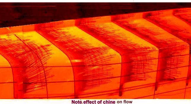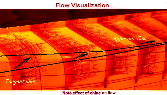 NOTE added May 2024: Although I have had this image somewhere on file for many years, I just relocated it and I think its worth sharing. It shows the result of a ship model test with flow lines from ink ports. On a 2nd copy, I have added the tangent lines of the bilge radius, hi-lighting how the flow crosses the radiius when the bilge radius is large but seems to run far more parallel when the bilge radius is sharp .. appearing to resist running around the sharp corner. It would be great if a tank test facility would do more tests on this phenomena, as this would indicate lower residuary resistance with the sharp chine corner ..... perhaps more than making up for the small amount of extra wetted surface. ie: flow taking the 'line of least resistance'. The square corner also offers fractionally more displacement low down which is also a positive thing. This clean fore-and-aft flow may help to explain the seemingly low forward drag of the W17, as well as explain why she has such little leeway. So those who think she would be better with a larger bilge radius, might want to reconsider why I have been resisting that ;) I might agree if this were not a sailboat that needs to go to windward well .... MW